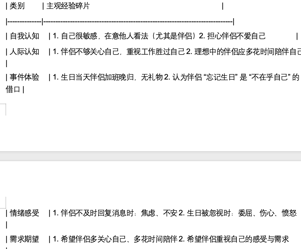 例如,飞米粒心理曾接待过一位因“亲密关系冲突” 而来访的女性来访者,在 “现象收集” 阶段,咨询师通过提问收集到了以下主观经验碎片: